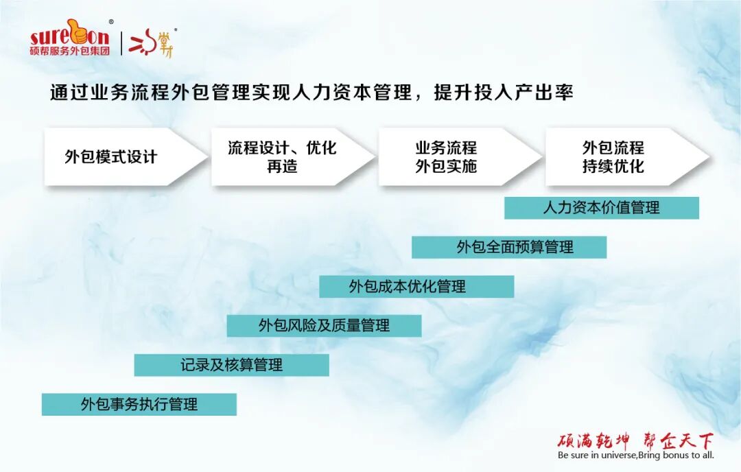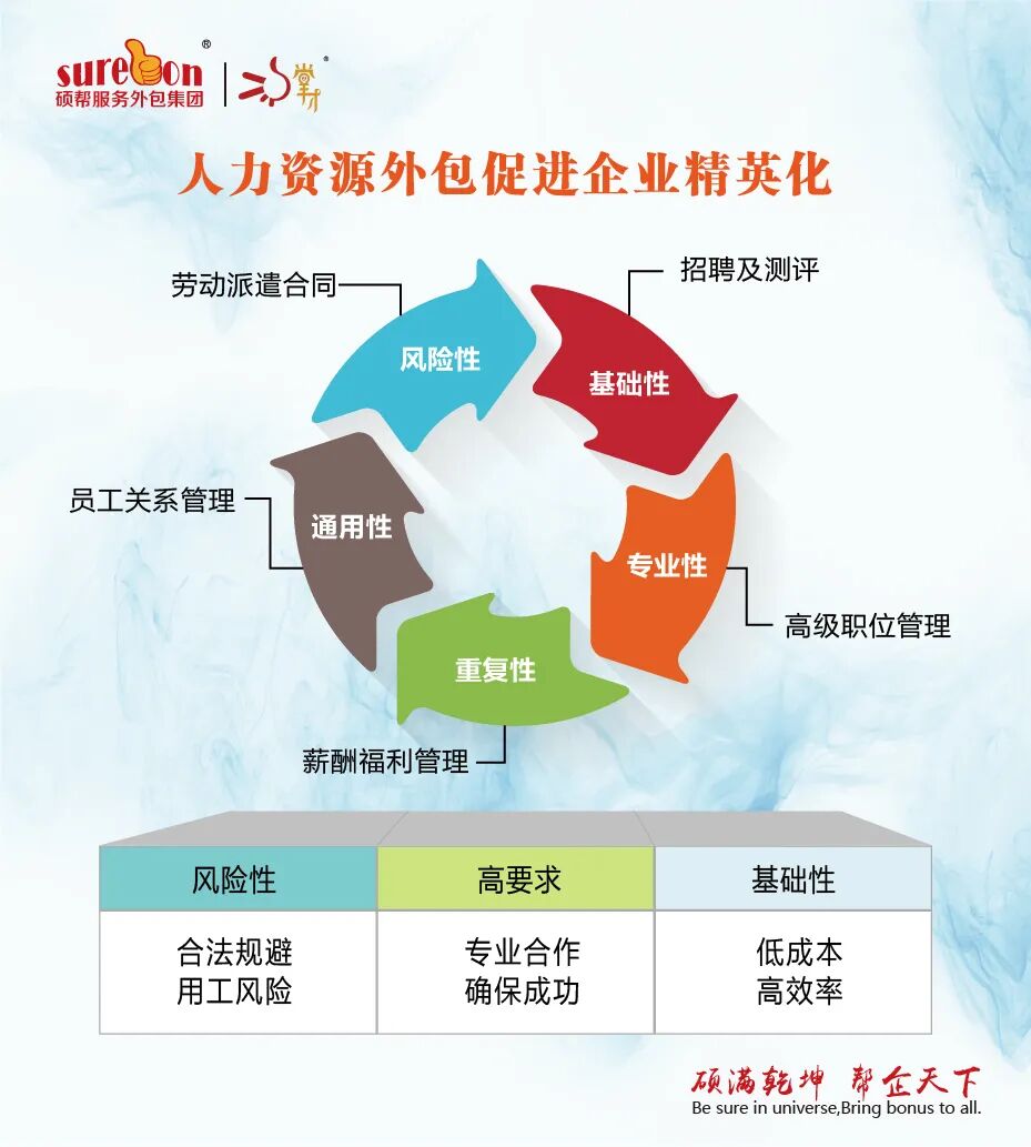 通过业务外包,可以节约企业人员招聘、内部管理和沟通的时间成本,让专业的人干专业的事,外包商的专业人力供应能力、人岗配置和现场管控能力能够使劳动效率最大化,整合外包商人力供应蓄水池,减少人员增减变化带来的招聘及补偿金费用支出,避免因员工工伤而导致的一系列烦琐手续及支付大额工伤费用。 通过外包商人力蓄水池迅速对企业产能的突发性变化,解决长期困扰企业的招聘难问题,解决部分企业明显的季节性用工和临时性用工,根据实际生产需要灵活调整外包员工工作时间与管理制度。 外包商承包非核心流程,使企业脱离低附加值工段的管理事务,专注于核心业务,使企业减少正式员工的编制,从而更专注于核心岗位的招聘和招聘体系的建立及维护。 五、帮助企业降低经营风险 七、帮助企业提高效率 八、帮助企业提升利润二、帮助企业规避用工风险(订单不稳、用工风险、政策风险)